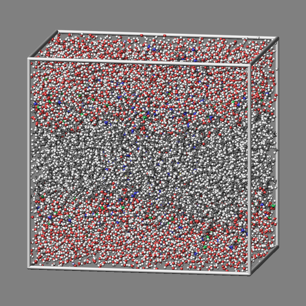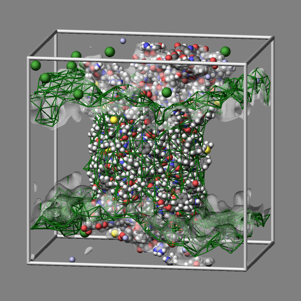 The commands below provide an example for how to use the graphics/isosurface fix to visualize the water and lipid bilayer of the “rhodo” benchmark example as isosurfaces by using a green wireframe and a transparent white triangle surface to represent those molecules.