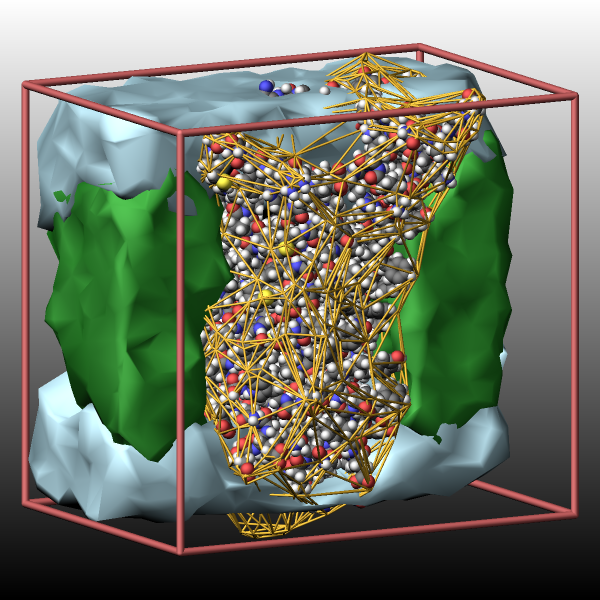 This fix generates graphics objects from chunks of atoms defined by the compute chunk/atom command. For each chunk a point cloud is created from the atom positions. By default, for clusters with up to 100 atoms, each atom is replaced by the the positions of an icosahedron scaled to the radius of the atom. For larger clusters the point cloud only uses atom positions that shifted away from the center of the cluster by the atom radius. The threshold value can be set by the maxreplace keyword. A triangulated surface is created from that point cloud using a 3-D Delaunay triangulation combined with alpha shape extraction. This allows the resulting surface to follow the shape of the chunks. The resulting list of graphics objects is passed to dump image for rendering via the fix keyword.